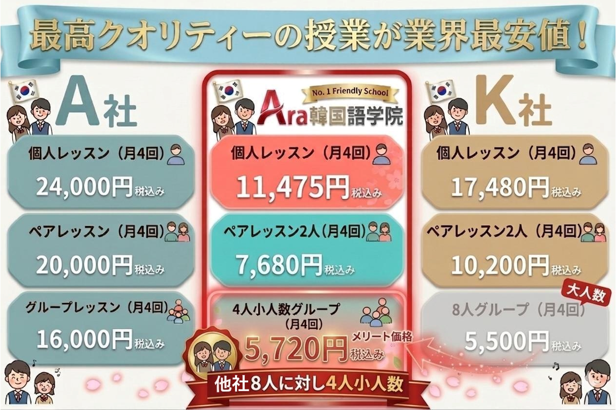 Ara韓国語学院「西宮北口校」は、語学学習の楽しさをより多くの方に伝えるために業界最安値で驚くほど質の高い授業を提供致します。安いからと言って授業の質を疑っていませんか? Ara韓国語学院「西宮北口校」では、より高クオリティーの韓国語授業を皆さんにお届けするため、定期的に韓国語教授法研究会を開催しています。常にご満足していただけるようアラ韓国語学院の講師一同、全力を尽くしてまいります。まずは、お気軽に無料体験レッスンを受けてみて下さい。
